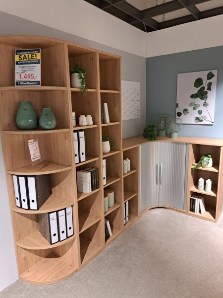 offene Regale kombiniert mit Jalousienschrank über Eck.